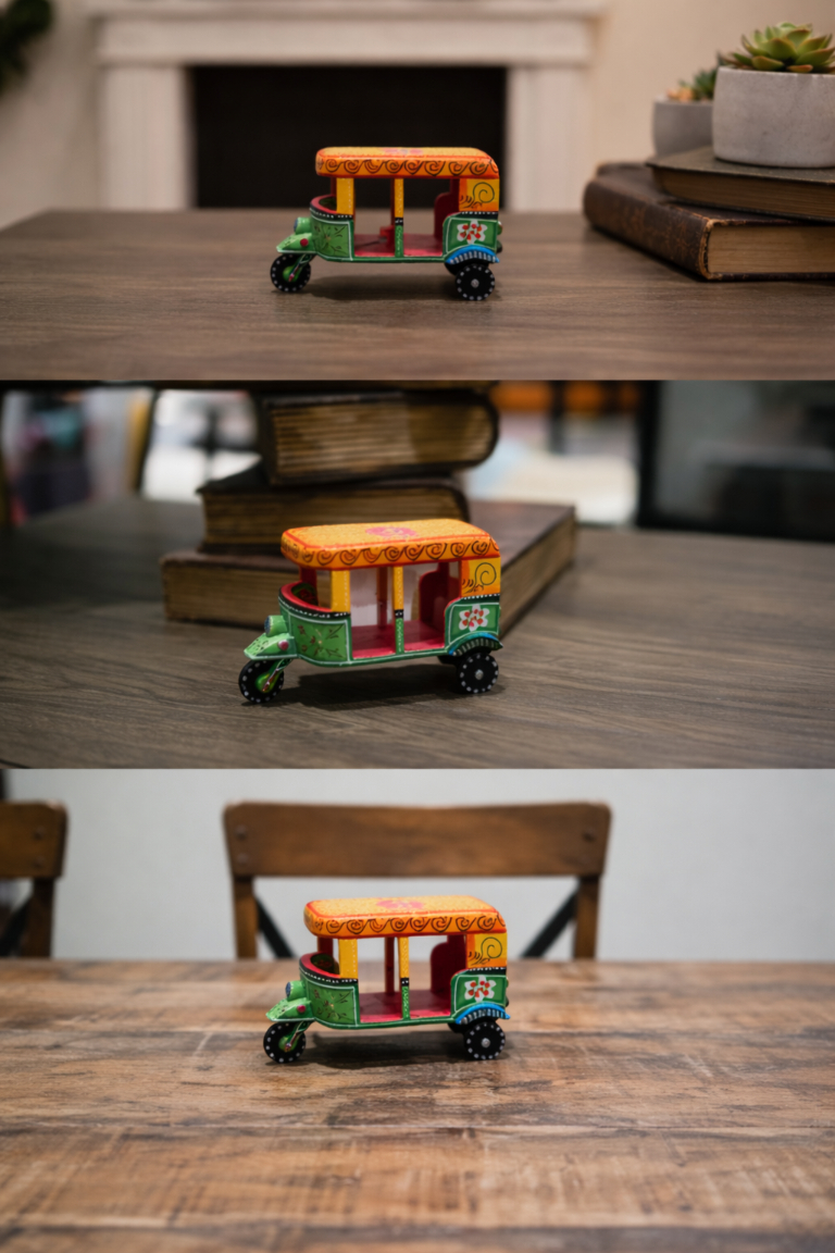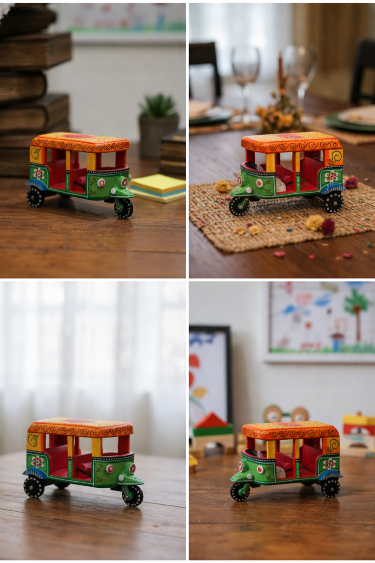 This charming auto rickshaw captures the soul of Indian streets with hand-painted details and lively colors. Crafted with care, it adds character, fun, and nostalgia to any corner. Each rickshaw features distinct artwork and playful textures.