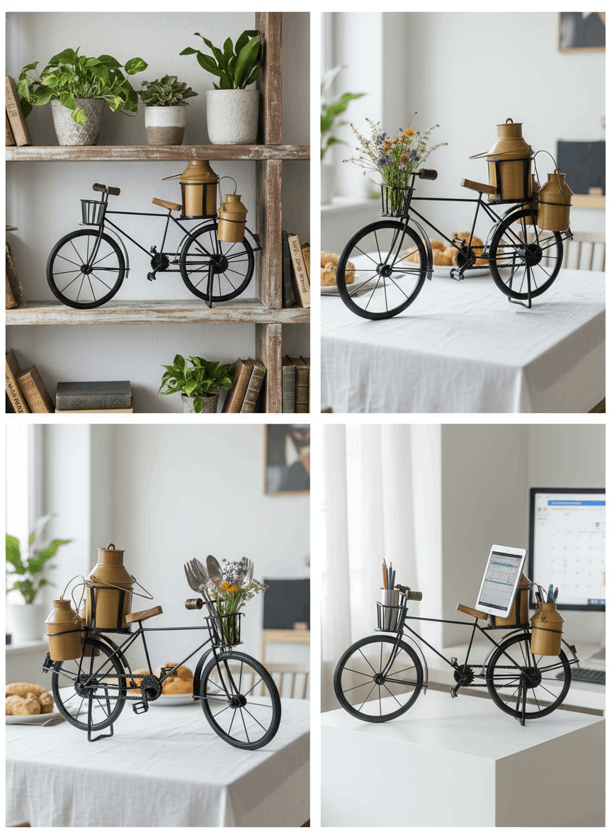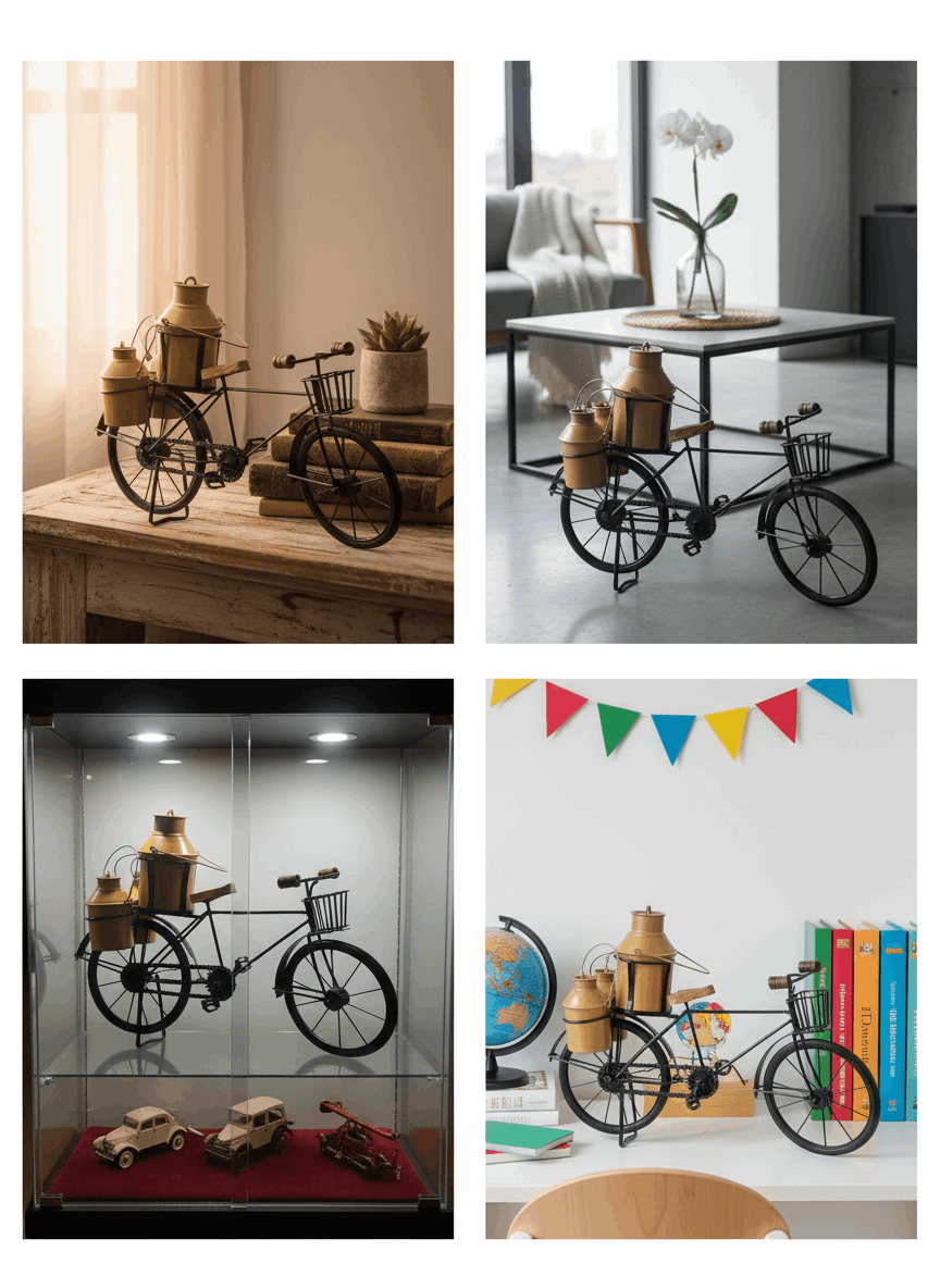 Bring back the warmth of old-world India with this beautifully handcrafted Milk Can Cycle décor. Designed with intricate metal detailing and a rustic milk can accent, this piece tells a story of village life, simplicity, and timeless charm. Crafted from sturdy metal with a vintage finish, it makes a striking décor accent for living rooms, balconies, shelves, or cafés. The miniature milk can adds character, making it a perfect conversation starter and a soulful décor element.