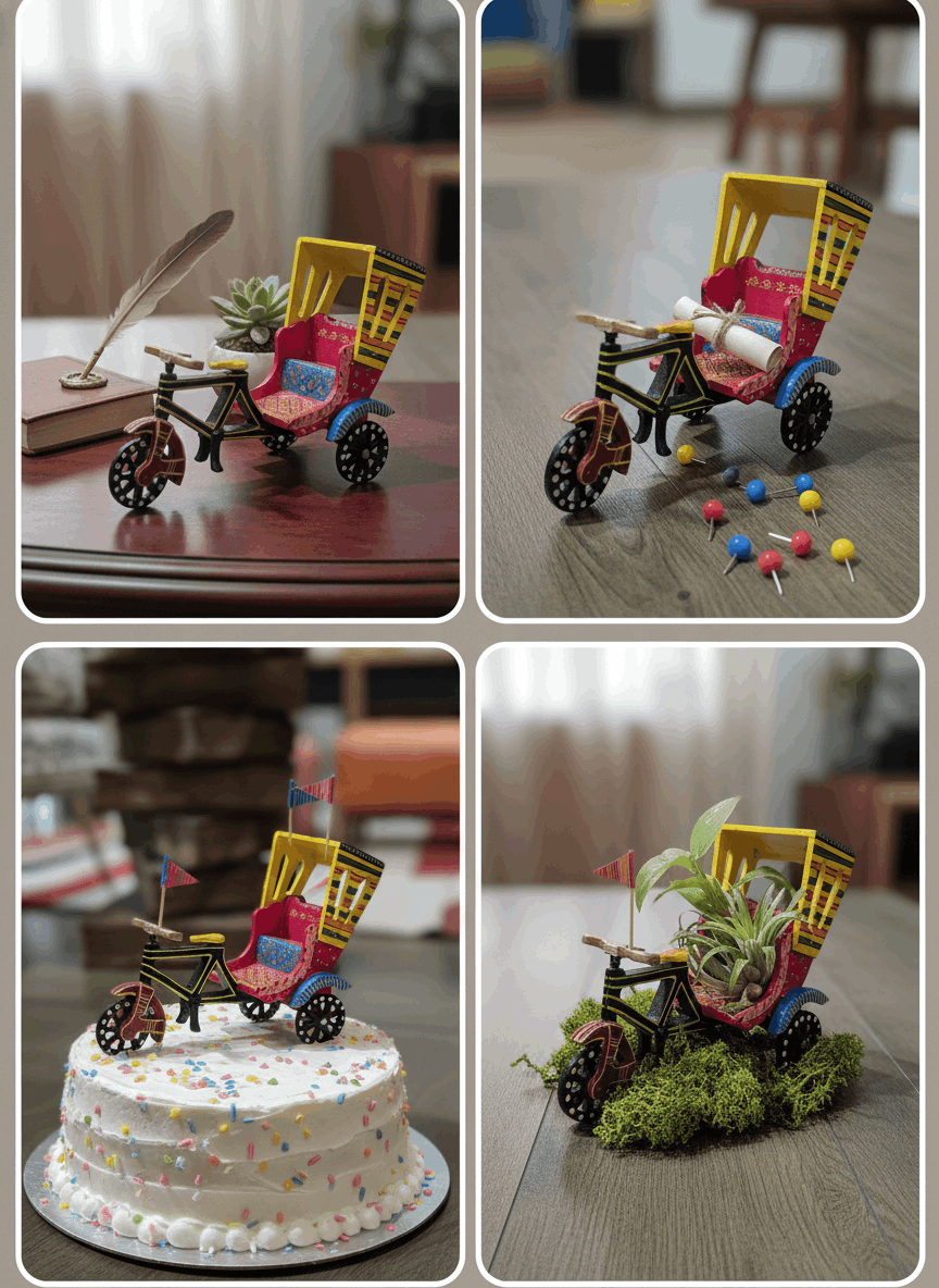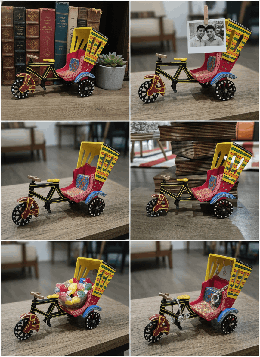 Crafted from wood and painted by hand, this decorative rickshaw captures traditional Indian street life through bold colors and detailed artwork. A perfect blend of fun, nostalgia, and craftsmanship.