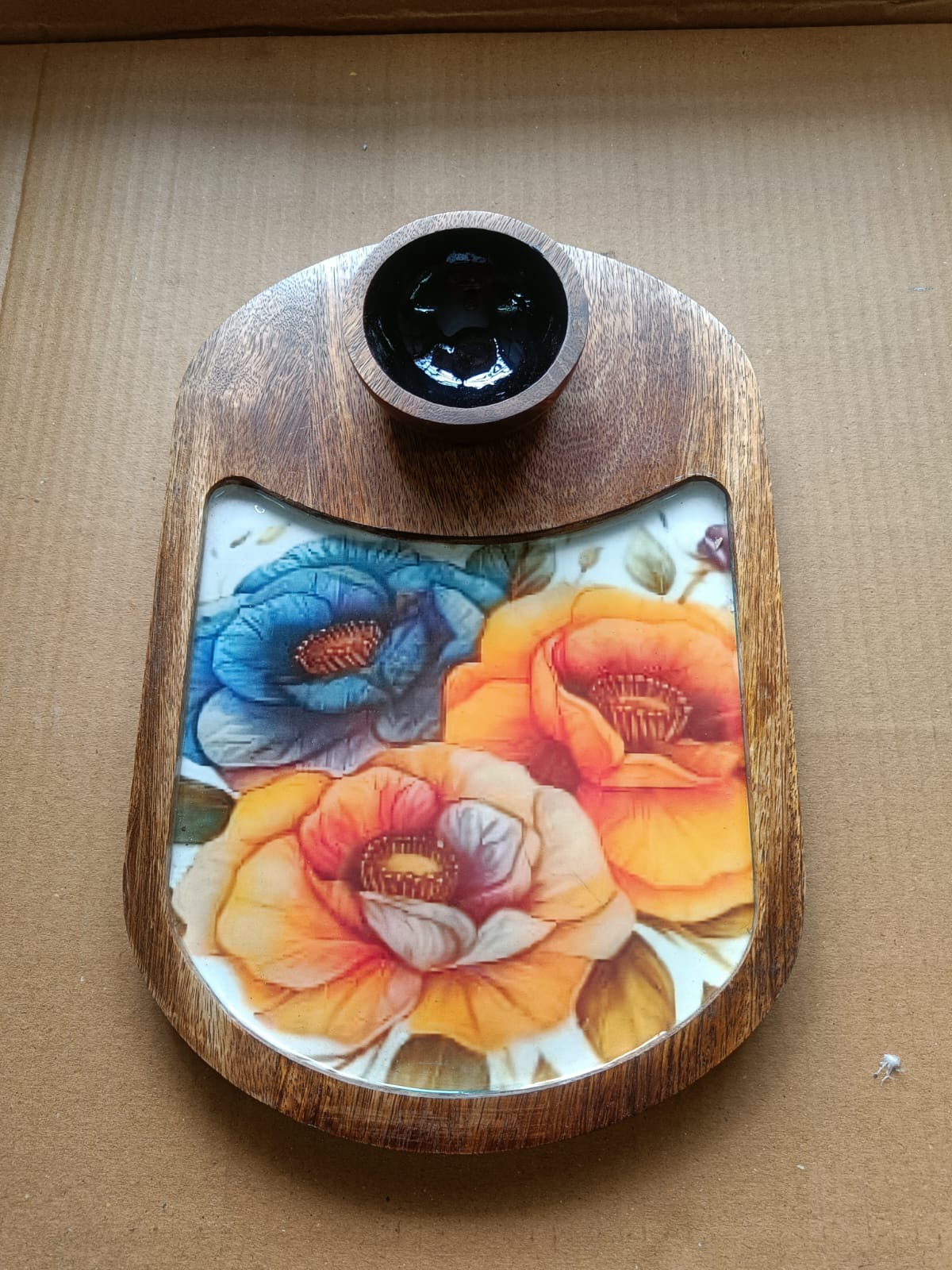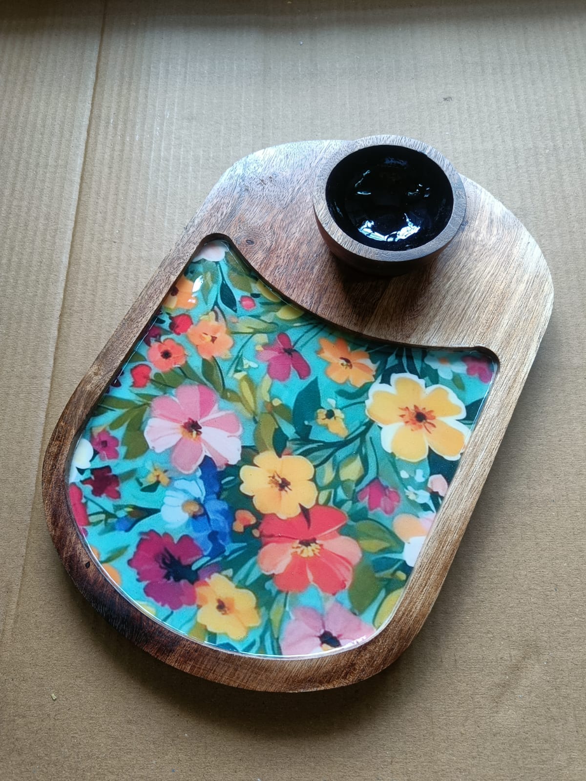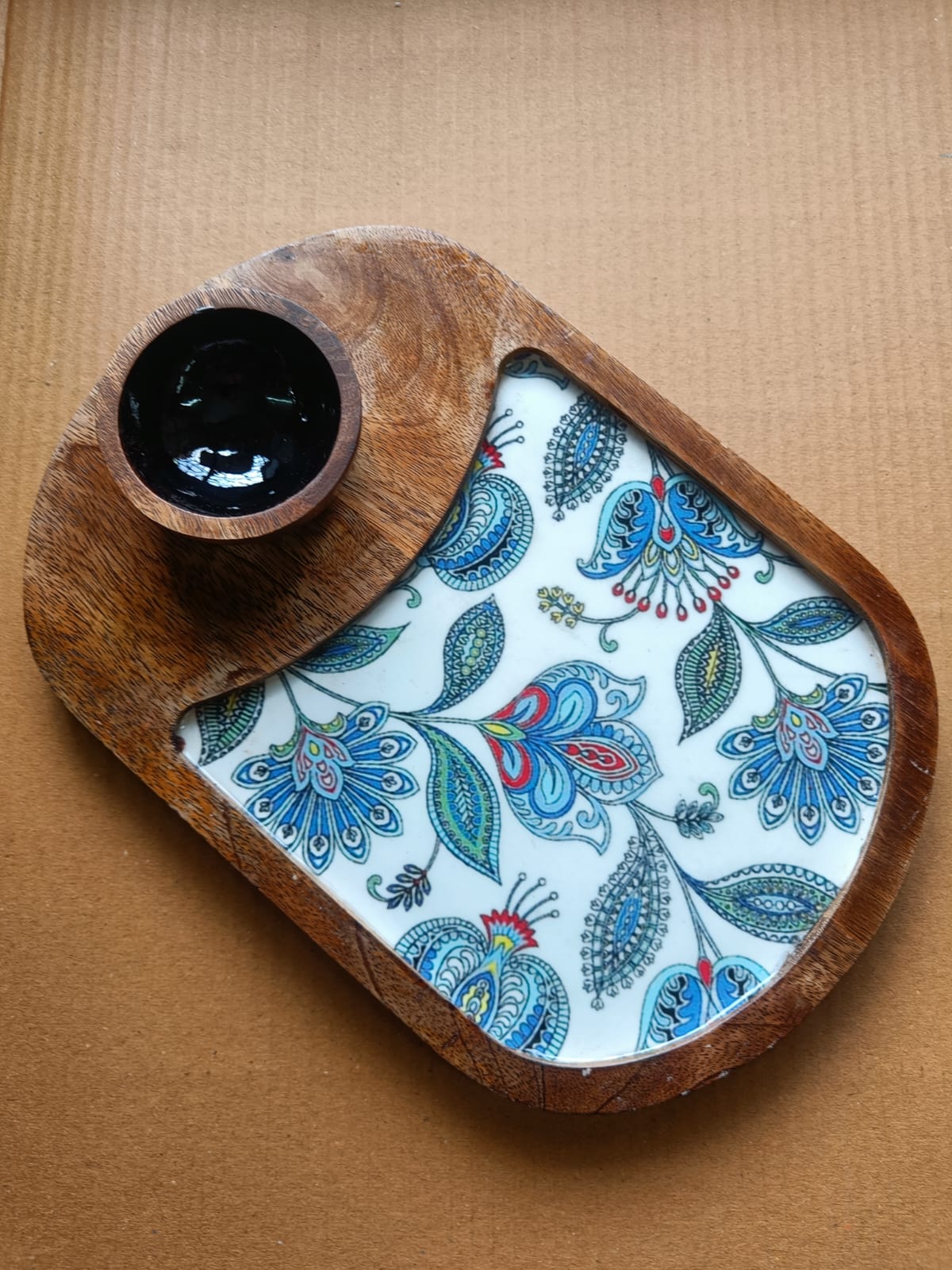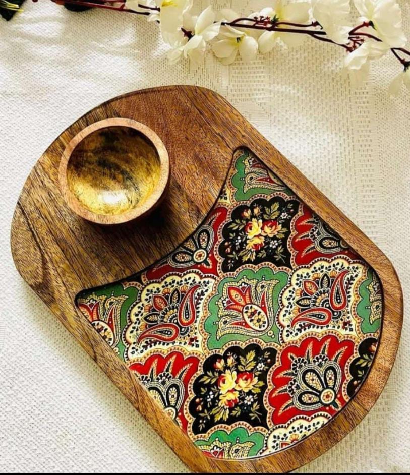 This oval-shaped wooden platter offers a sleek and elongated form that elevates everyday serving. Accented with a decorative patterned base and natural wooden edges, it adds sophistication without being overwhelming. Its shape makes it ideal for serving sides, sweets, or appetisers while maintaining a clean, organized presentation. Each piece showcases distinct textures and prints inspired by artisanal craftsmanship.