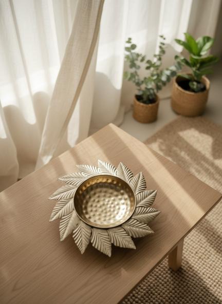 From floating flowers and candles to centerpiece décor, this urli set transforms any space into a visually rich and elegant setting. The unique leaf-inspired design and modern candle stand structure bring together tradition and contemporary style effortlessly.