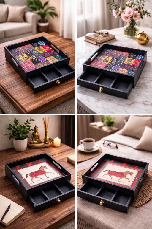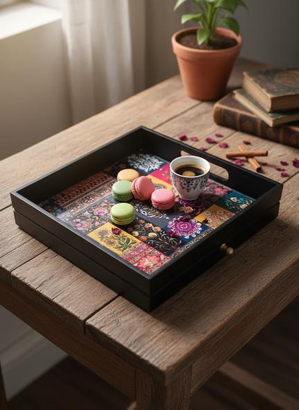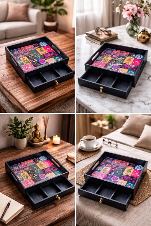 Featuring a spacious serving surface with artistic prints and a hidden drawer with compartments, it allows you to serve snacks, beverages, or meals while keeping essentials neatly organized. Whether it’s cutlery, condiments, or small accessories, everything stays within easy reach.