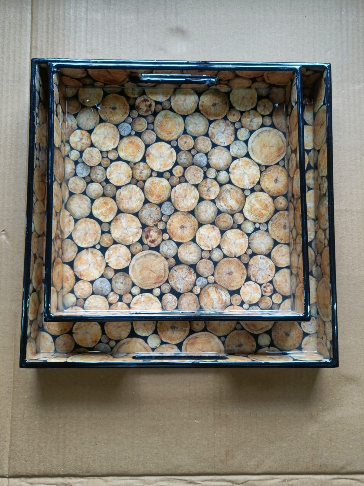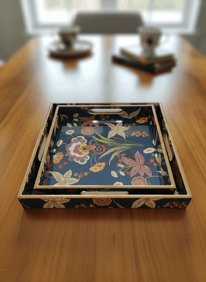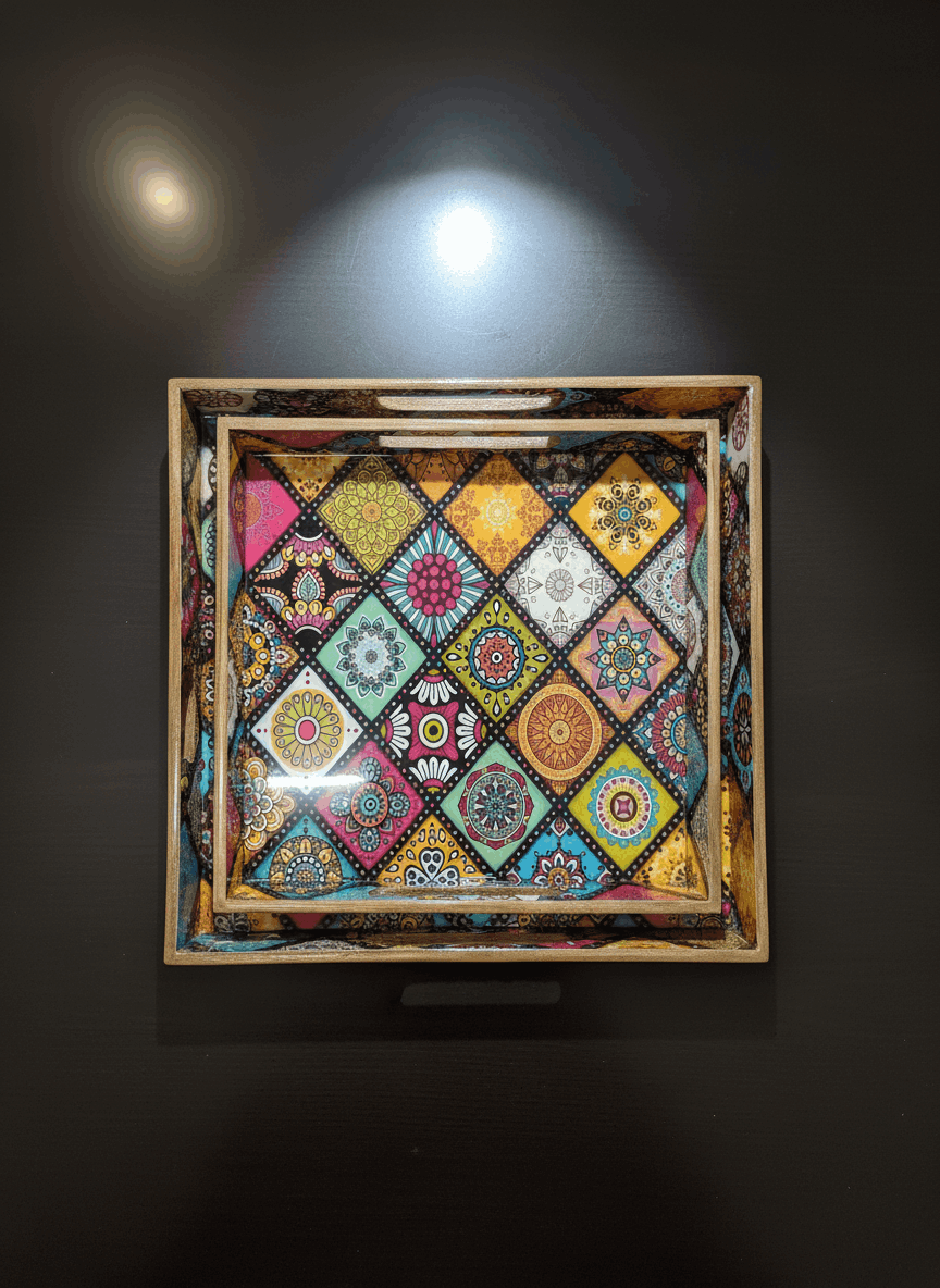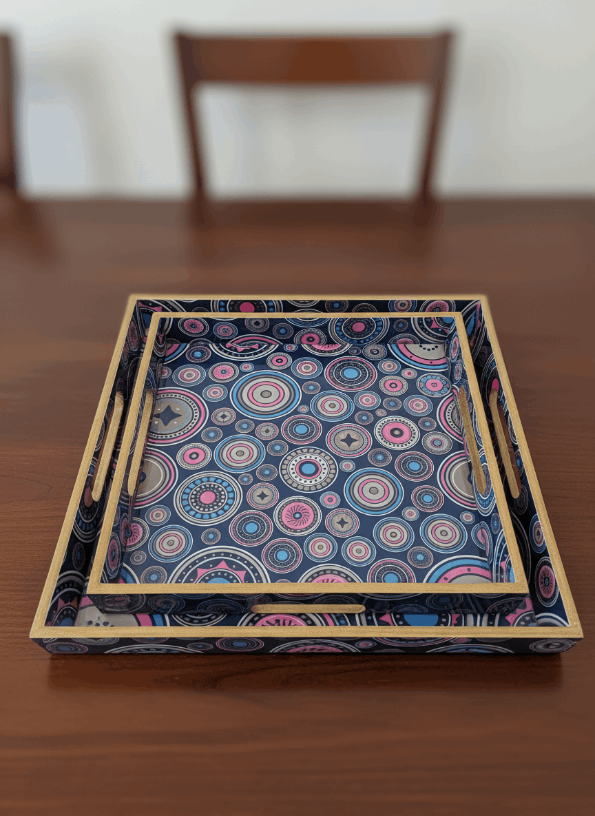This set of two square wooden trays is crafted for those who appreciate understated elegance. Featuring rich wooden textures combined with beautiful printed bases, these trays bring both functionality and décor value to your home. Each set comes in different patterns and surface designs, making them suitable for a variety of interior styles.