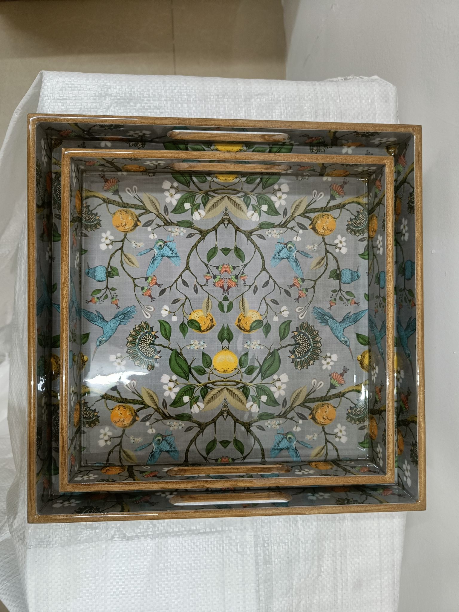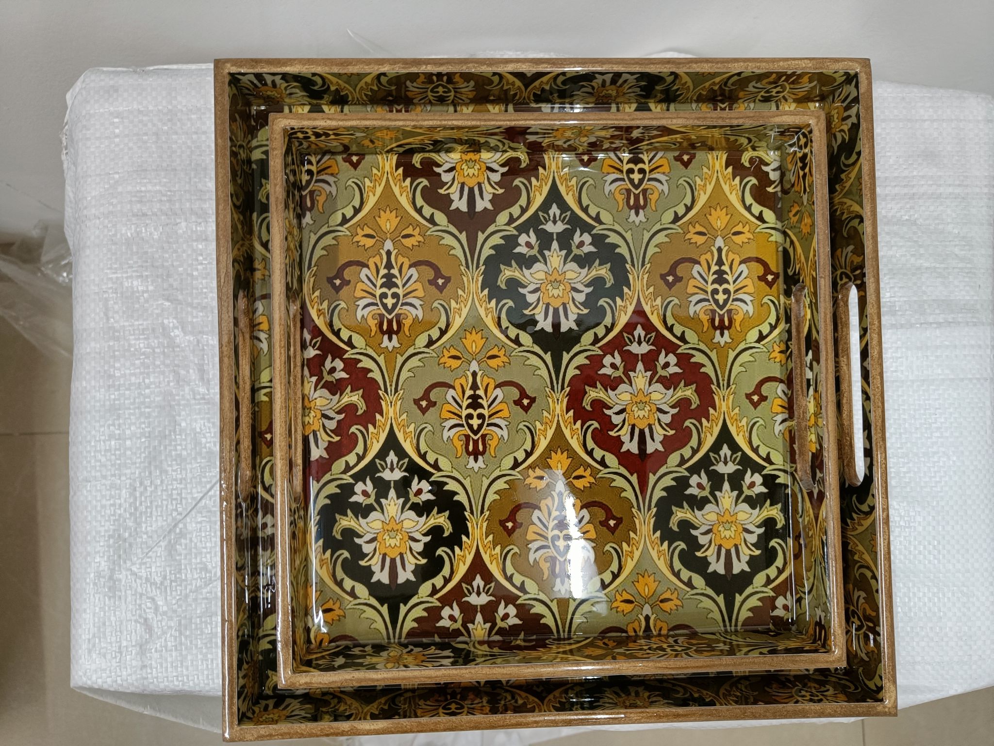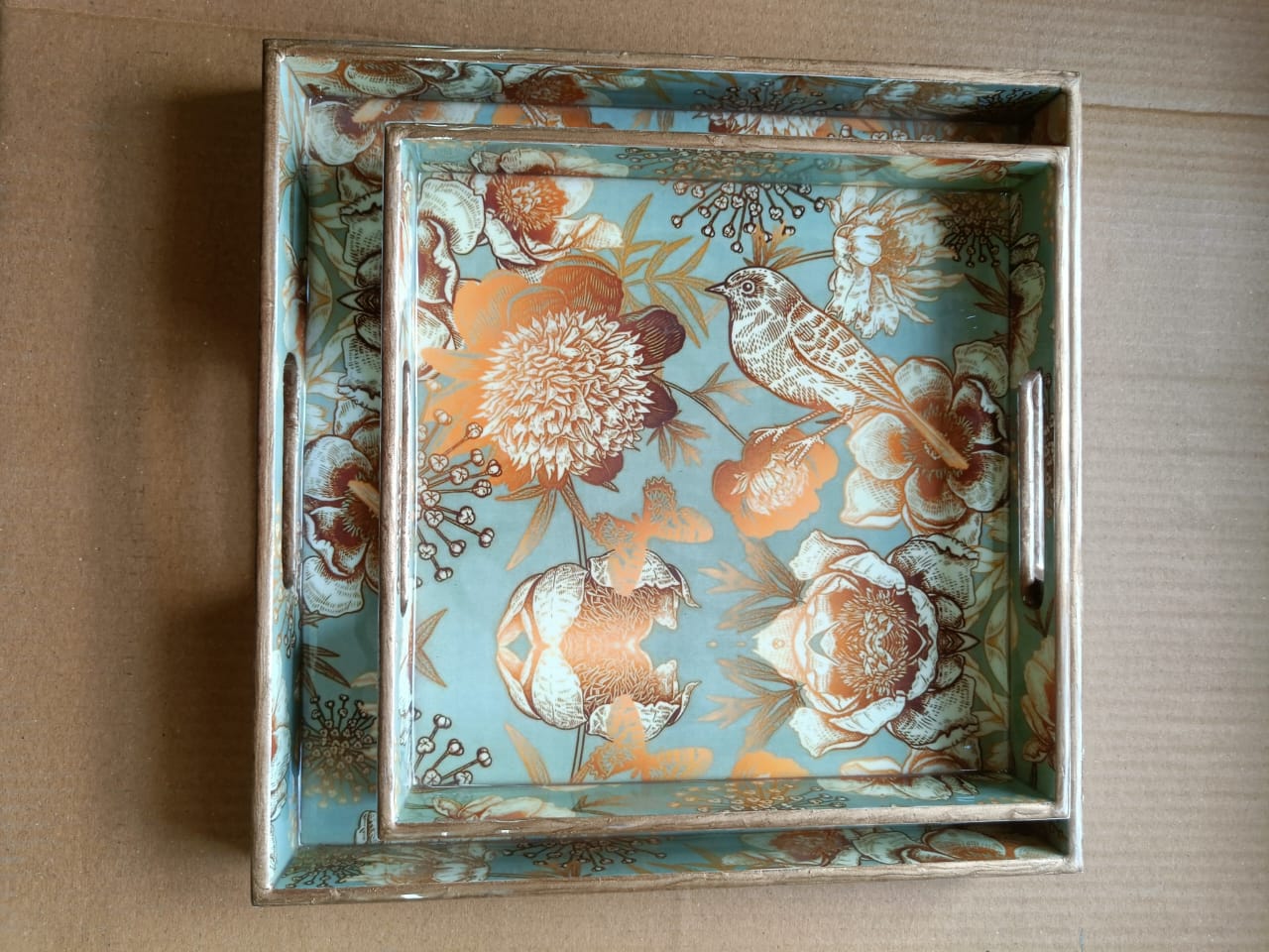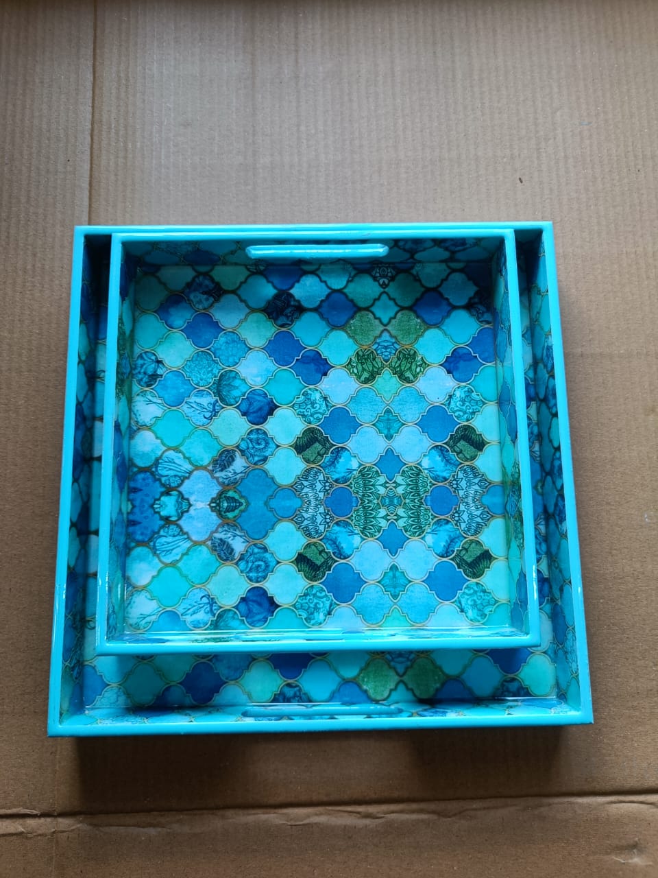 This set of two square wooden trays is crafted for those who appreciate understated elegance. Featuring rich wooden textures combined with beautiful printed bases, these trays bring both functionality and décor value to your home. Each set comes in different patterns and surface designs, making them suitable for a variety of interior styles.
